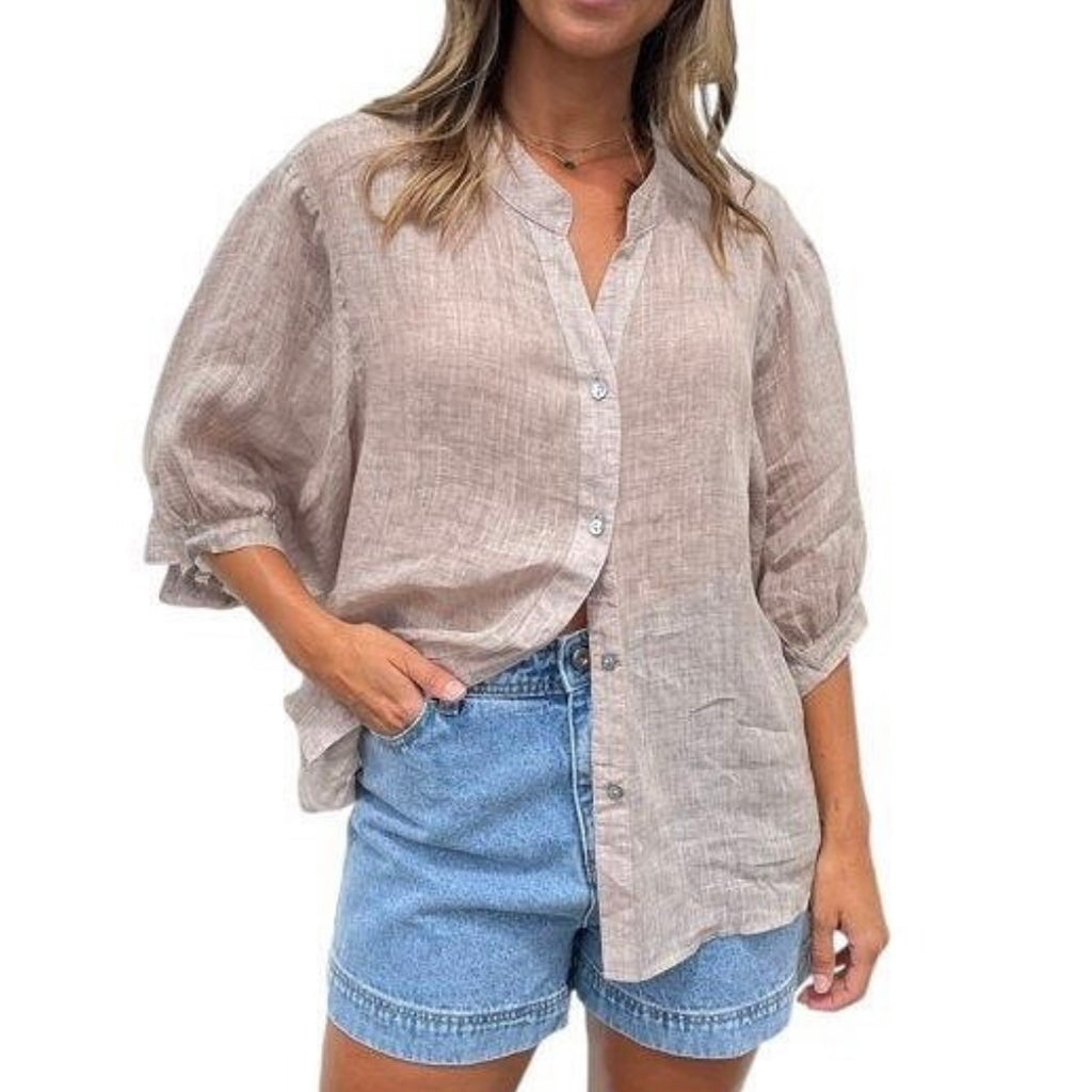 Linen button back top chocolate